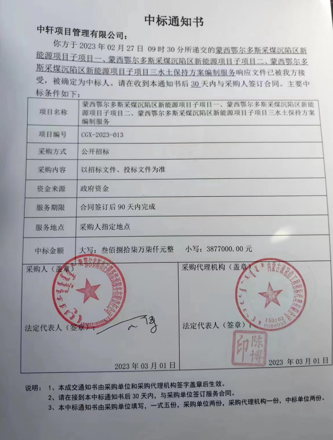 我公司成功中标蒙西鄂尔多斯采煤沉陷区新能源项目子项目一、蒙西鄂尔多斯采煤沉陷区新能源项目子项目二、蒙西鄂尔多斯采煤沉陷区新能源项目子项目三水土保持方案编制服务项目。