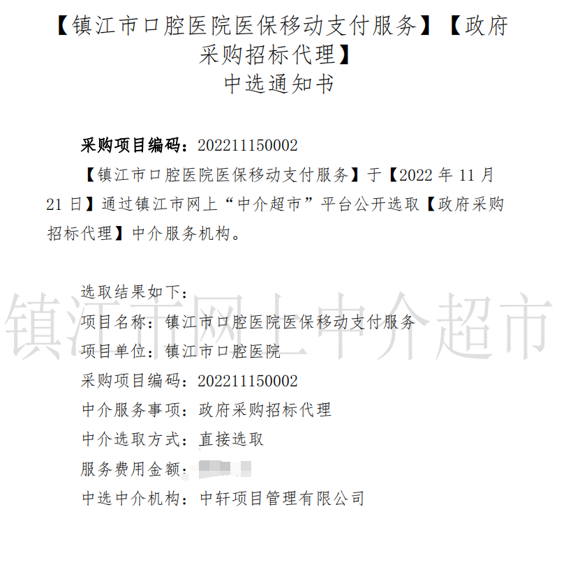 近日,我公司参与了“镇江市口腔医院医保移动支付服务项目”,经评审委员会综合评审,项目业主确认,确定中轩项目管理有限公司成功中标镇江市口腔医院医保移动支付服务项目。