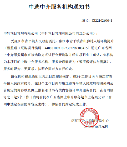 近日,我公司参与了“廉江市青平镇青山脚村人居环境提升工程监理服务项目”,经评审委员会综合评审,项目业主确认,确定中轩项目管理有限公司成功中标廉江市青平镇青山脚村人居环境提升工程监理服务项目。