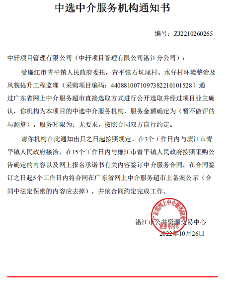 近日,我公司参与了“青平镇石坑尾村、水仔村环境整治及风貌提升工程监理”,经评审委员会综合评审,项目业主确认,确定中轩项目管理有限公司成功中标青平镇石坑尾村、水仔村环境整治及风貌提升工程监理服务项目。