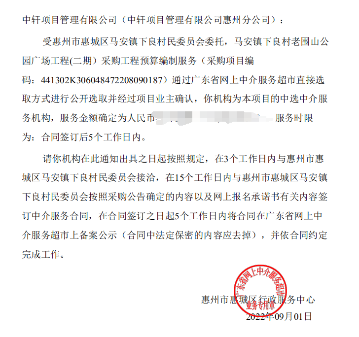 近日,我公司参与了“马安镇下良村老围山公园广场工程(二期)采购工程预算编制服务项目”,经评审委员会综合评审,项目业主确认,确定中轩项目管理有限公司成功中标马安镇下良村老围山公园广场工程(二期)采购工程预算编制造价咨询服务项目。