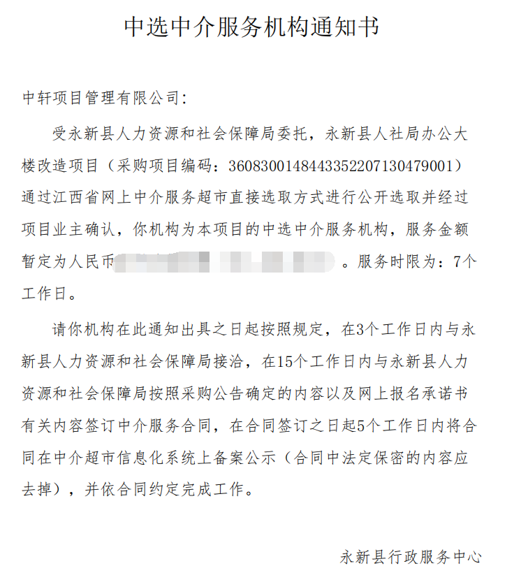 近日,我公司参与了“永新县人社局办公大楼改造项目”, 经评审委员会综合评审,项目业主确认,确定中轩项目管理有限公司成功中标永新县人社局办公大楼改造项目。