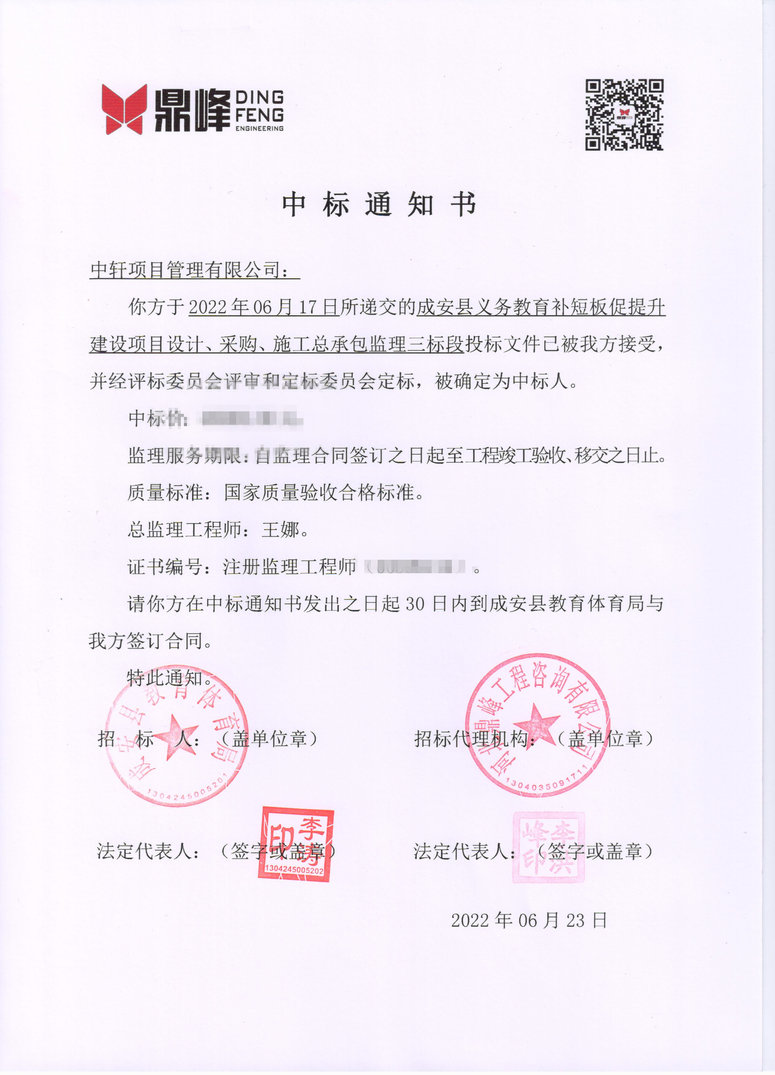 近日,我公司参与了“成安县义务教育补短板促提升建设项目设计、采购、施工总承包监理三标段项目”, 经评审委员会综合评审,项目业主确认,确定中轩项目管理有限公司成功中标成安县义务教育补短板促提升建设项目设计、采购、施工总承包监理三标段监理项目。