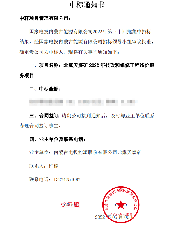 近日,我公司参与了国家电投内蒙古能源有限公司2022年第四十三批集中招标关于“北露天煤矿 2022 年技改和维修工程造价服务项目”, 经评审委员会综合评审,国家电投内蒙古能源有限公司确认,确定中轩项目管理有限公司成功中标北露天煤矿 2022 年技改和维修工程造价服务项目。