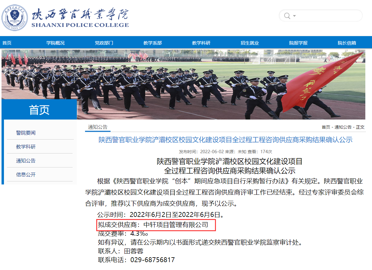 近日,我公司参与了“陕西警官职业学院浐灞校区校园文化建设项目全过程工程咨询服务项目”, 经评审委员会综合评审,项目业主确认,确定中轩项目管理有限公司成功中标陕西警官职业学院浐灞校区校园文化建设项目全过程工程咨询服务项目。