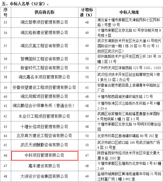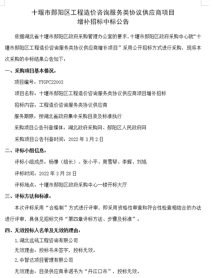 近日,我公司参与了“十堰市郧阳区工程造价咨询服务类协议供应商项目增补招标项目”,经评审委员会综合评审,中轩项目管理有限公司成功入围十堰市郧阳区工程造价咨询服务类协议供应商项目增补招标服务项目。