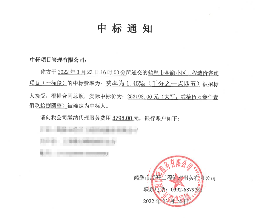 近日,我公司参与了“鹤壁市金融小区工程造价咨询服务项目(一标段)”, 经评审委员会综合评审,项目业主确认,确定中轩项目管理有限公司成功中标鹤壁市金融小区工程造价咨询服务项目(一标段)。
