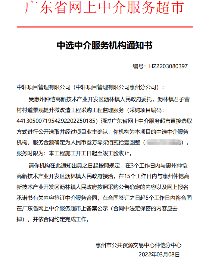 3.1日,中轩项目管理有限公司参与了“沥林镇君子营村村道景观提升微改造工程采购工程监理服务项目”(项目编号:4413050071954292202250185),经评审委员会综合评审,项目业主确认,中轩项目管理有限公司成功中标沥林镇君子营村村道景观提升微改造工程采购工程监理服务项目,项目投资243.38万元。