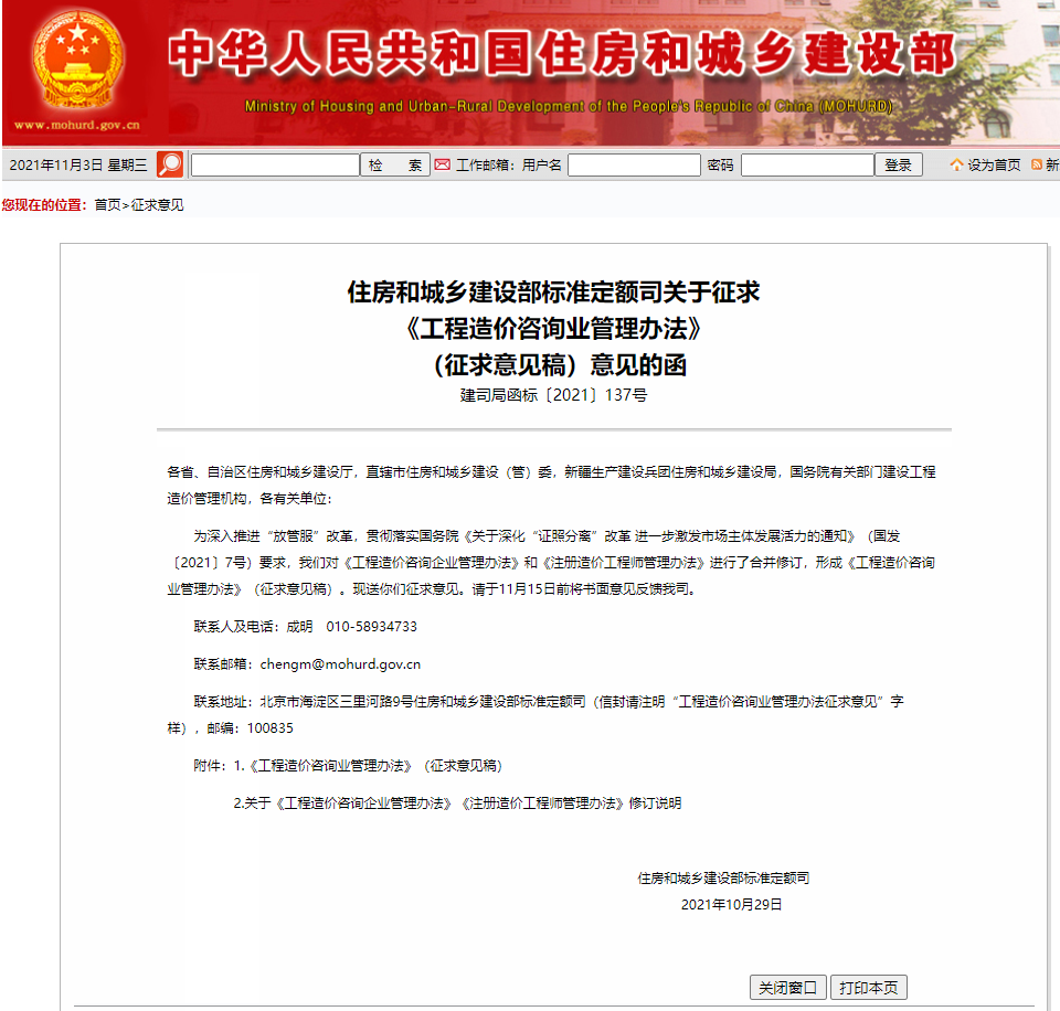 为深入推进“放管服”改革,贯彻落实国务院《关于深化“证照分离”改革 进一步激发市场主体发展活力的通知》(国发〔2021〕7号)要求,我们对《工程造价咨询企业管理办法》和《注册造价工程师管理办法》进行了合并修订,形成《工程造价咨询业管理办法》(征求意见稿)。现送你们征求意见。请于11月15日前将书面意见反馈我司。