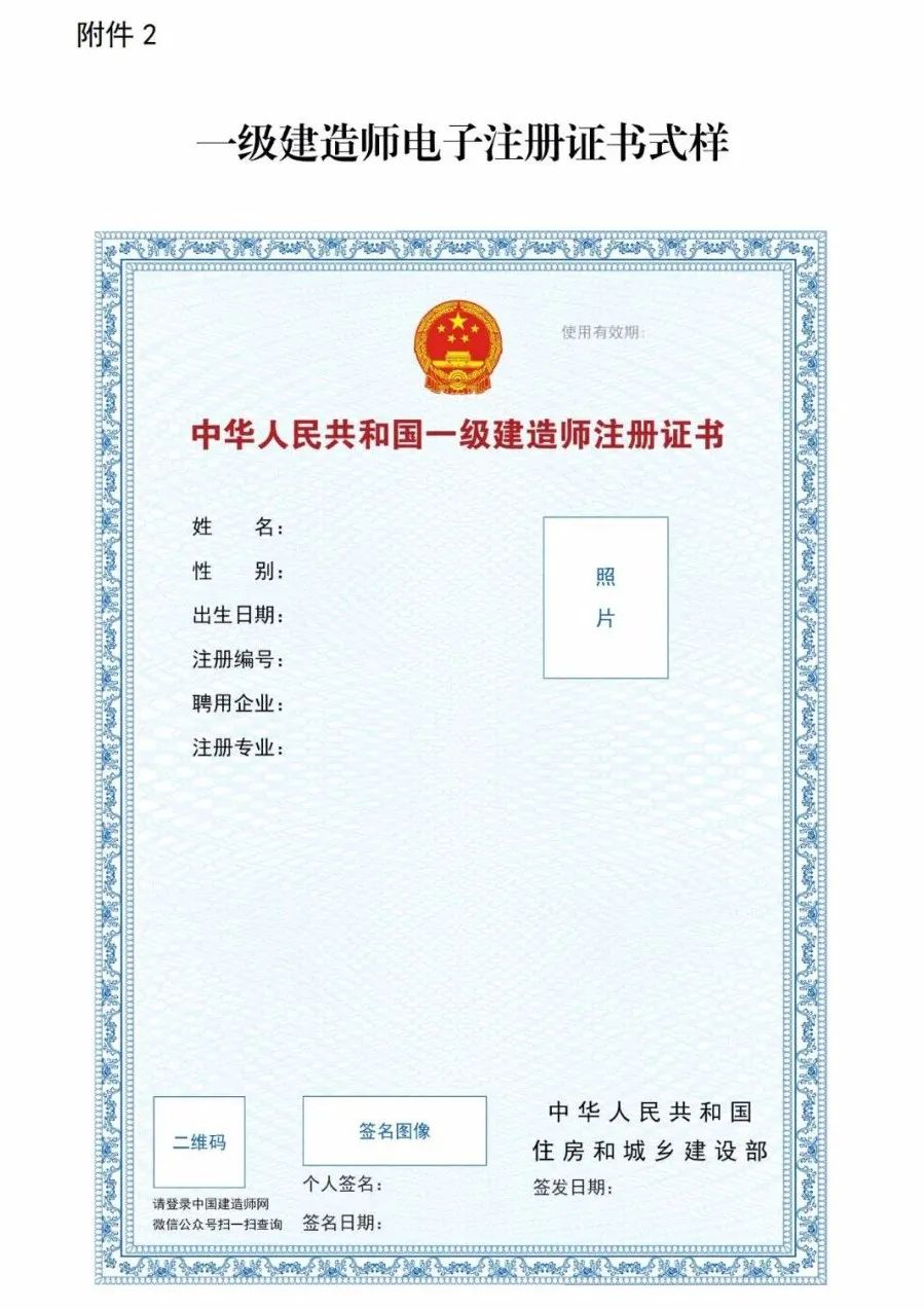 1.自2021年10月15日起,在全国范围内实行一级建造师电子证书(具体示例及说明见附件1),电子证书式样按照《全国一体化在线政务服务平台电子证照一级建造师注册证书》标准执行(具体式样见附件2)。自2022年1月1日起,一级建造师统一使用电子证书,纸质注册证书作废。