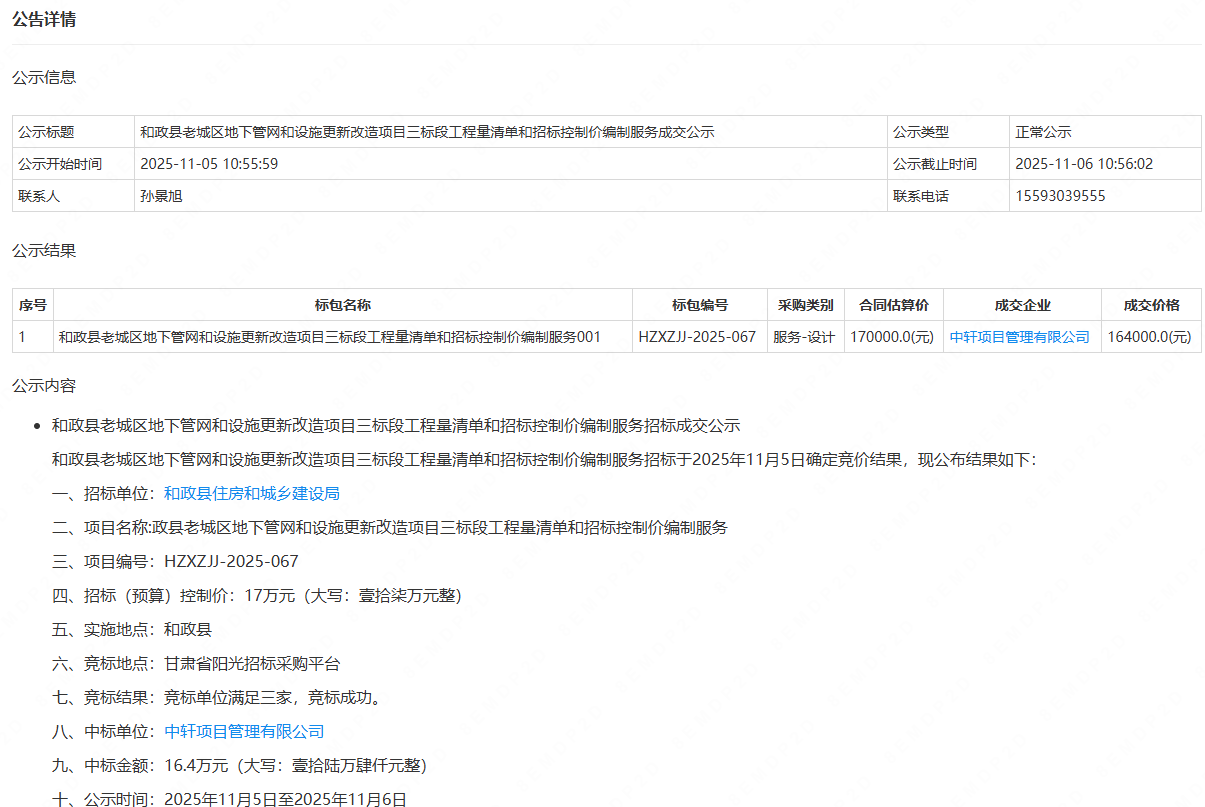 11月6日,我公司中标和政县老城区地下管网和设施更新改造项目三标段工程量清单和招标控制价编制服务。公司将以公开、公平、公正的负责态度,坚持客户至上的宗旨完成工作内容。