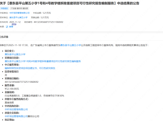 10月12日,我公司惠东县平山第五小学1号和4号教学楼拆除重建项目可行性研究报告编制服务。公司将以公开、公平、公正的负责态度,坚持客户至上的宗旨完成工作内容。