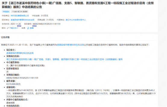 11月26日,我公司中标湛江市遂溪中医药特色小镇(一期)广信路、支路5、智敏路、善贤路和支路6工程一标段施工全过程造价咨询(含预算编制)服务。公司将以公开、公平、公正的负责态度,坚持客户至上的宗旨完成工作内容。