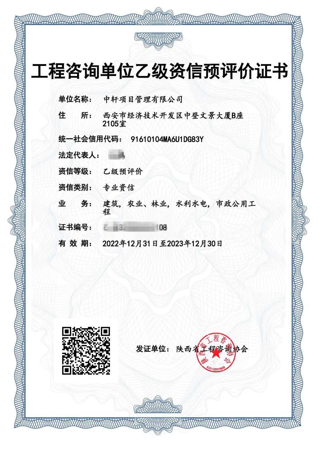 2023年新年伊始,我公司迎来重大喜讯:经陕西省工程咨询协会综合评价,我公司荣获工程咨询单位乙级资信资质,包括建筑、林业、农业、水利水电、市政公用工程四个专业。