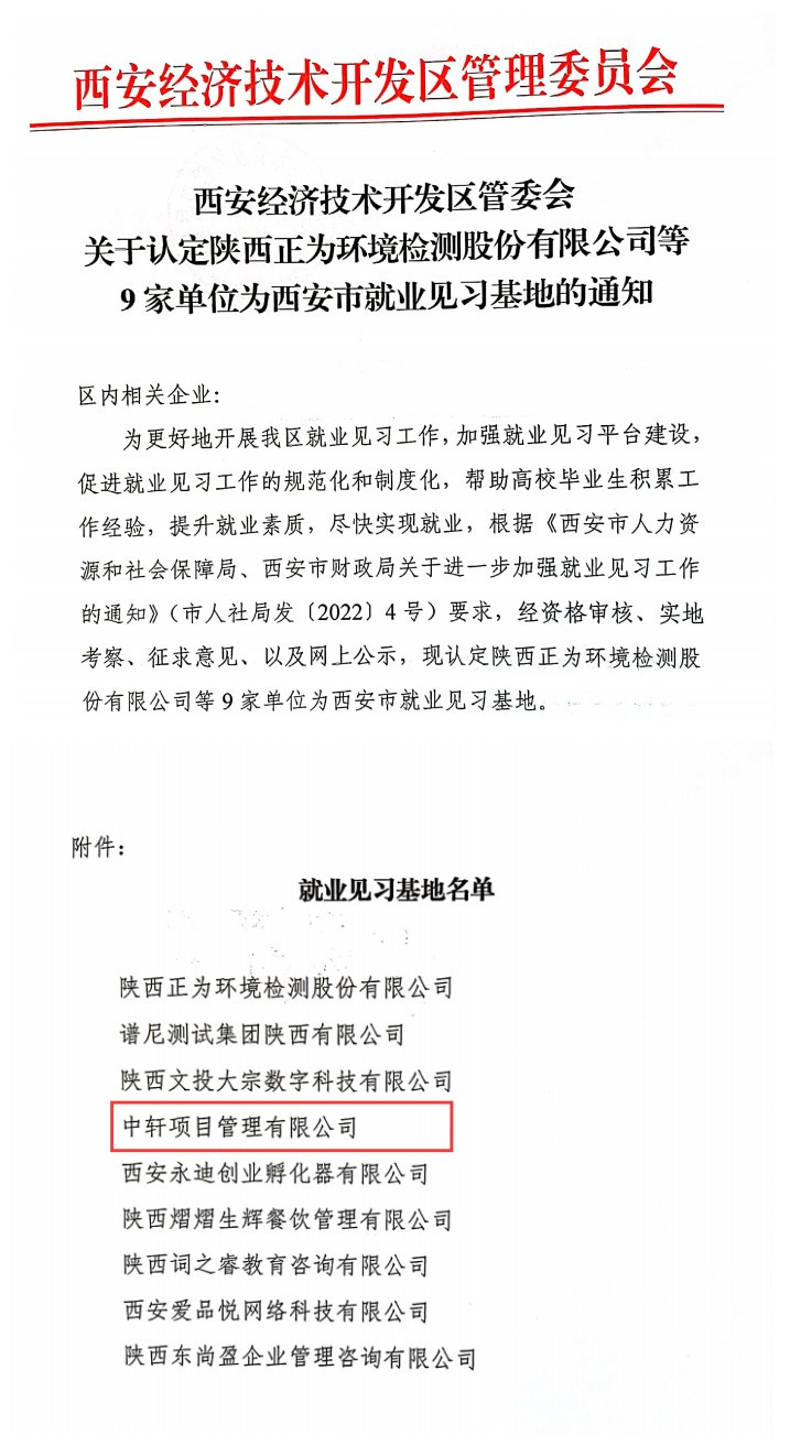 6月21日,西安市人力资源和社会保障局公布了2022年西安市大学生就业见习基地名单,经严格考察、综合评审,中轩项目管理有限公司成功评选“西安市高校毕业生就业见习基地” 。