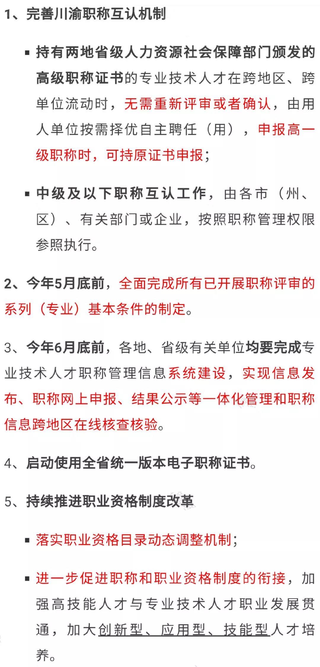 三、完善川渝职称互认机制。认真贯彻习近平总书记关于“成渝地区双城经济圈”建设重要讲话精神和中央决策部署,积极探索区域性职称互认机制。持有两地省级人力资源社会保障部门颁发的高级职称证书的专业技术人才在跨地区、跨单位流动时,无需重新评审或者确认,由用人单位按需择优自主聘任(用),申报高一级职称时,可持原证书申报;中级及以下职称互认工作,由各市(州、区)、有关部门或企业,按照职称管理权限参照执行。