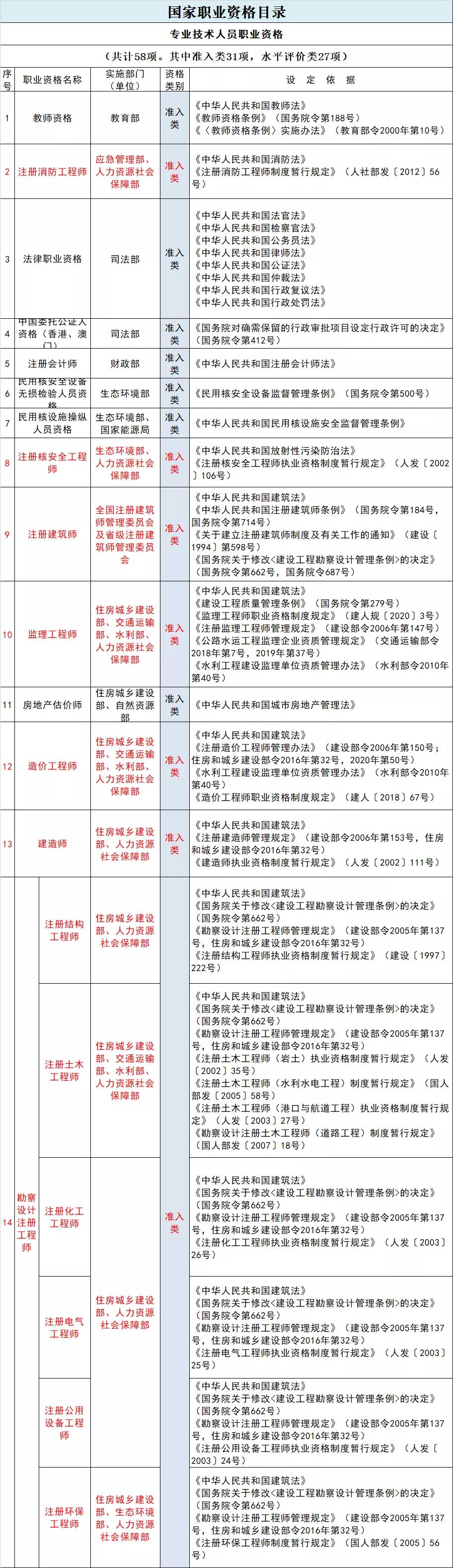 调整后,拟列入专业技术人员职业资格58项,其中,准入类31项,水平评价类27项。主要变化有: